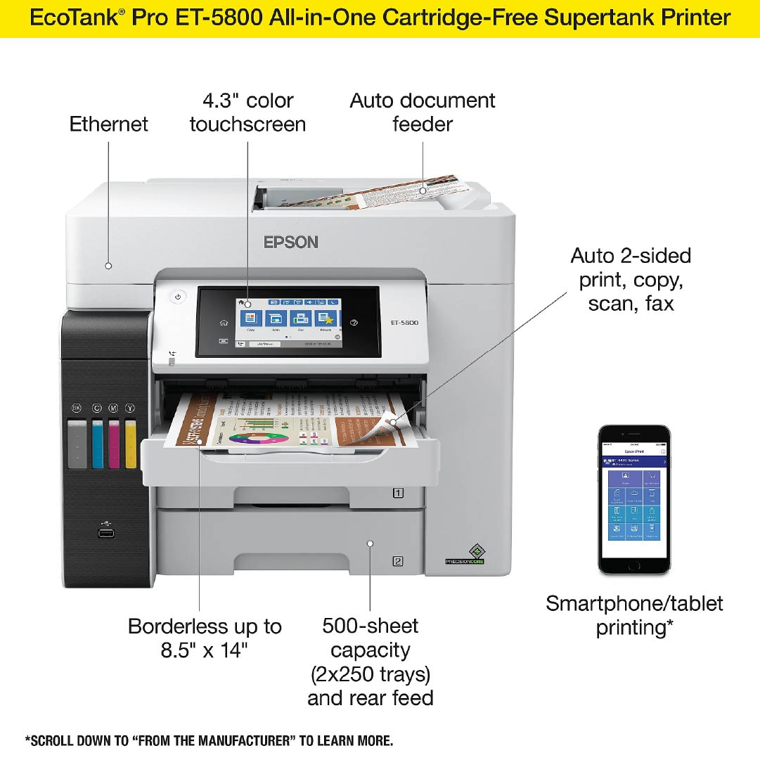 4 Epson® EcoTank® Pro ET-5800 Wireless Inkjet All-In-One Color Printer |